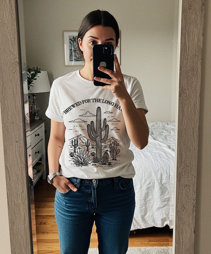 This one’s for the ones who ride it out—slow mornings, long roads, deeper pours. With cactus-lined vibes and clean desert minimalism, this tee anchors your coffee ritual with timeless calm.