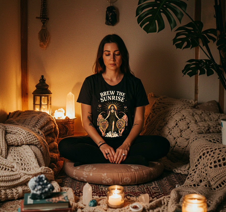 Inspired by the strength of the sun and the spirit of the lion, this shirt channels bold feminine energy into your ritual. Featuring a goddess walking between two lions, bathed in morning light, it's designed for women who rise with purpose, sip with presence, and chase their fire.