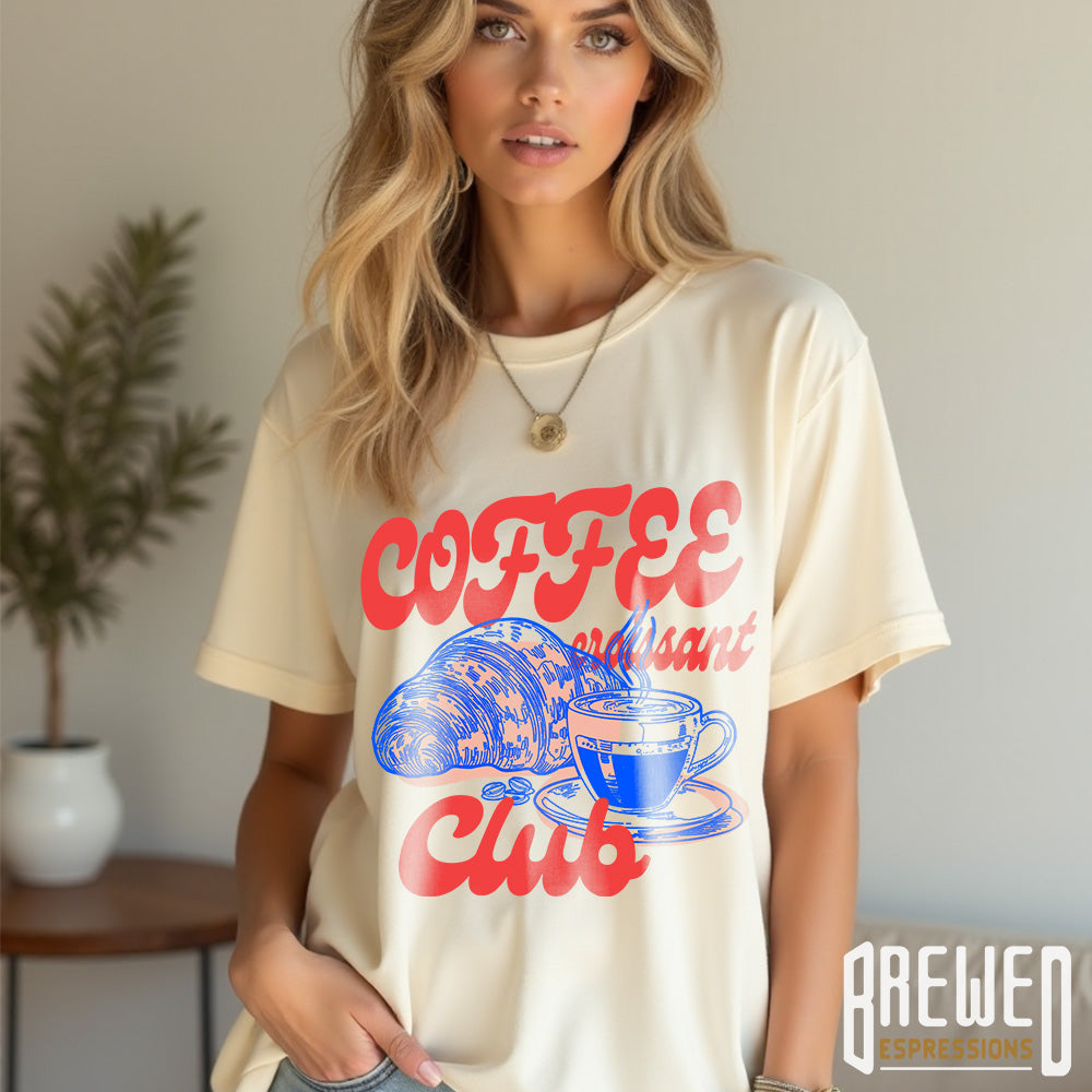 ▪ Vintage-style artwork with bold “Coffee & Croissant Club” text in retro red and blue